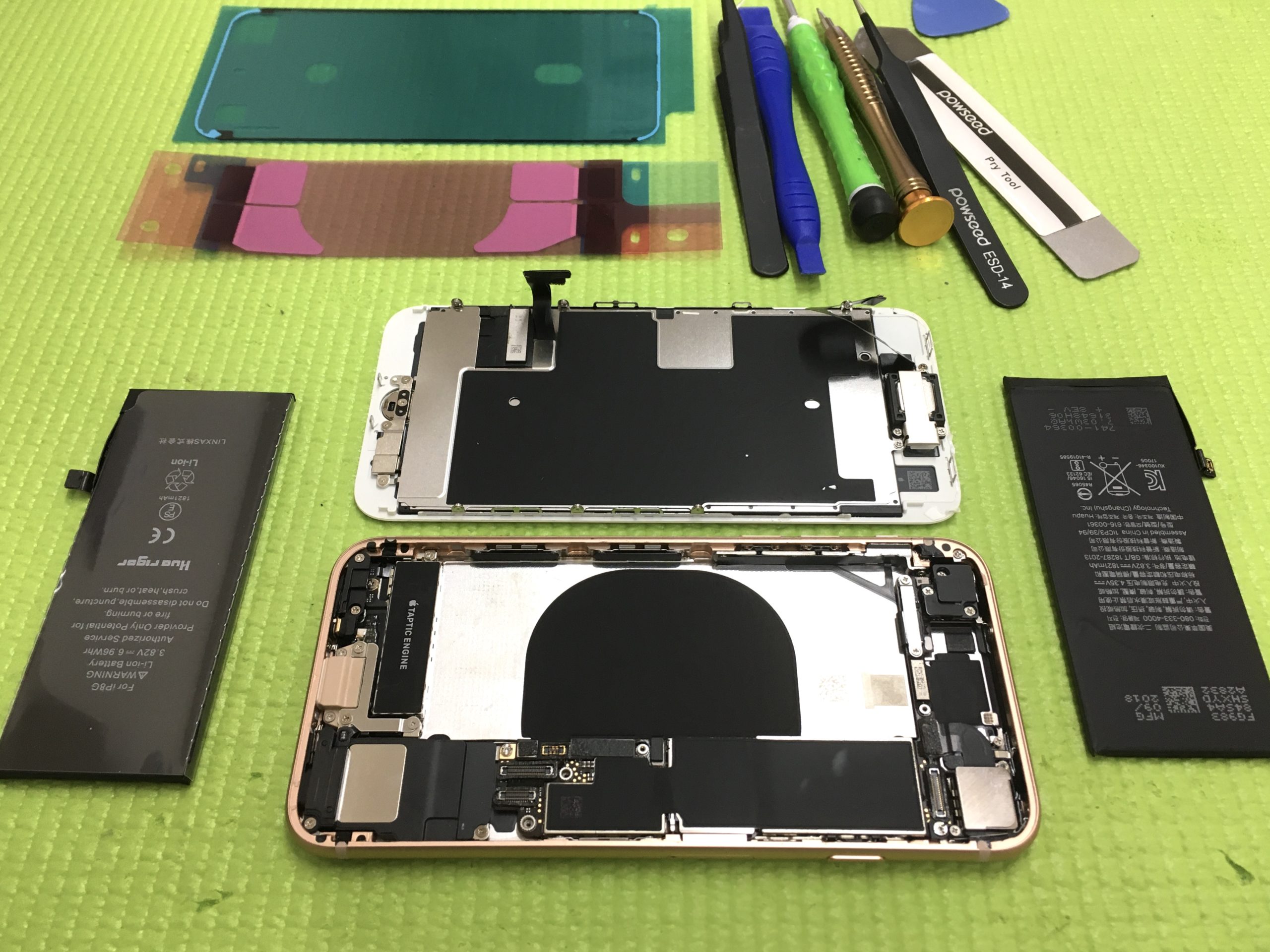 <作業>開封後、バッテリー交換いたしました。iPhone8は、外観はiPhone7と似ていて区別がつきにくいです。こちらのお客様もご自分ではiPhone7だと仰っていらっしゃいましたが、実際はiPhone8です。わたし的にはiPhone7の方がバッテリー交換作業はやりやすいです。