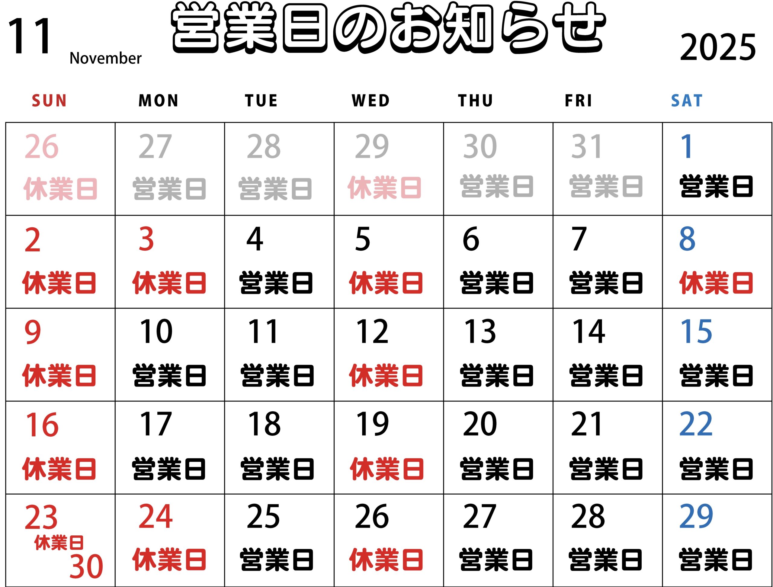 不定休(カレンダー参照)